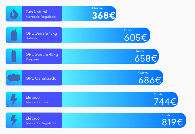 Valores de Dezembro de 2025 baseados em consumo médio anual de casal e 2 filhos, equivalente a 3407 kWh/ano. Gás Natural: 2º escalão. Eletricidade: Tarifa simples 6,9 kVA. Garrafas 13Kg Butano = 19 garrafas/ano; Garrafas 45Kg Propano = 6 garrafas/ano; Fator de conversão gás de garrafa: Poder Calorífico Superior (PCS). Fonte: Simulador ERSE | Relatório Mensal GPL Engarrafado (ERSE) – Preço eficiente com margens | Tarifa GPL Canalizado (Casa Galp).Os valores apresentados incluem as taxas e impostos aplicáveis com exceção da taxa DGEG e Taxa de Ocupação de Subsolo (TOS) – Para mais informações acesse o Simulador TOS da ERSE.